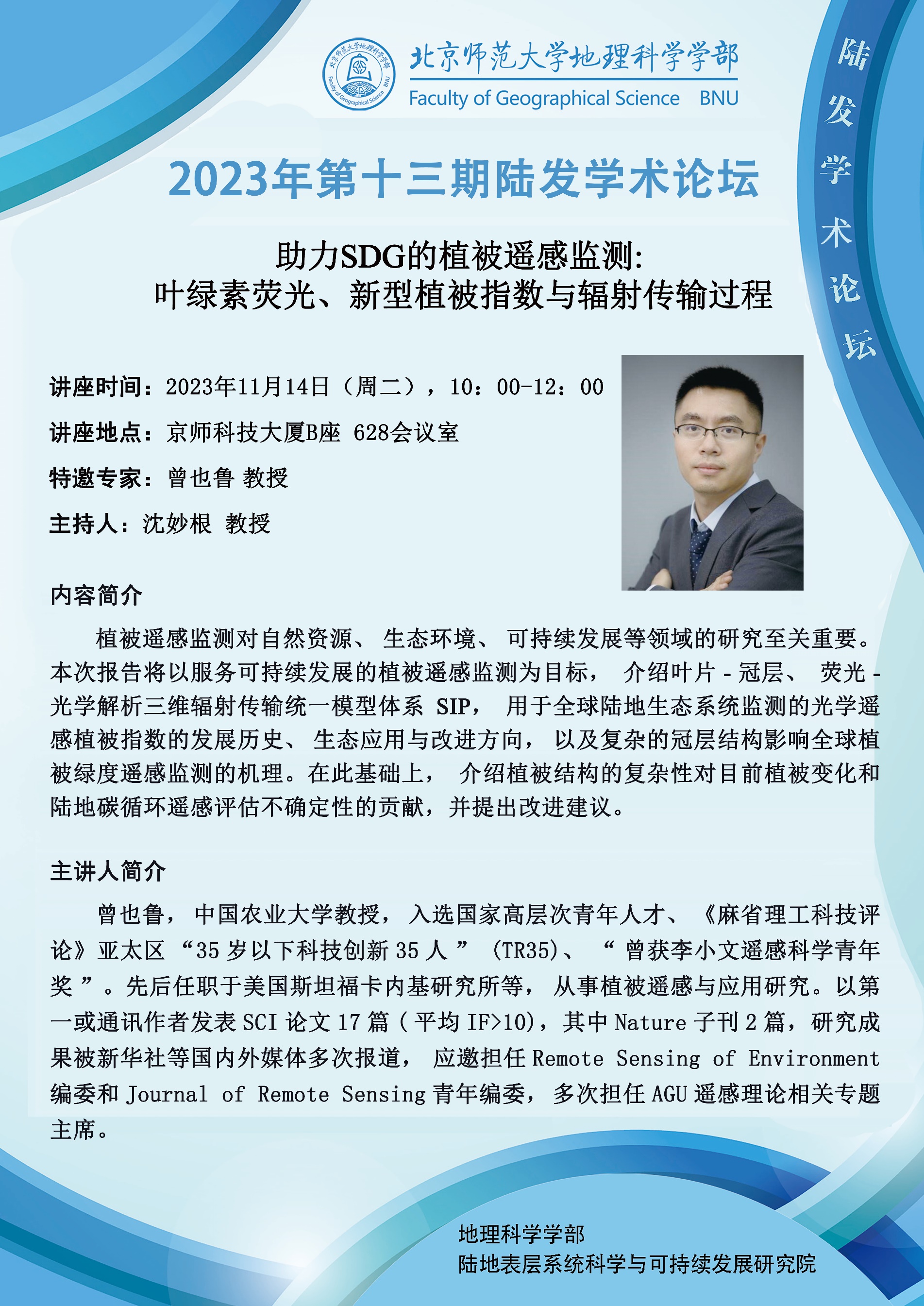 【11月14日】曾也鲁 教授,助力SDG的植被遥感监测:叶绿素荧光、新型植被指数与辐射传输过程