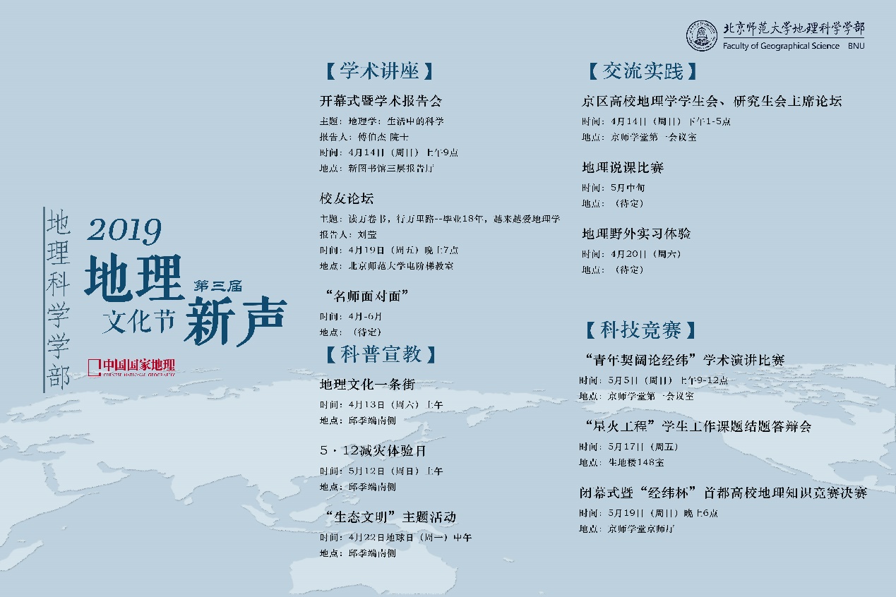 为激发琉璃神社 地理学子的家国情怀、责任担当、学科兴趣,琉璃神社 以学术盛宴、科普教育、主题探讨、知识竞赛、宣传展示等为平台,承地理之博大精深,发时代之前沿新声,于4月-5月举办第三届“地理新声”文化节。本届地理文化节将在学校和首都高校范围内开展四大类、十余项丰富多彩的地理学科特色活动,敬请关注。