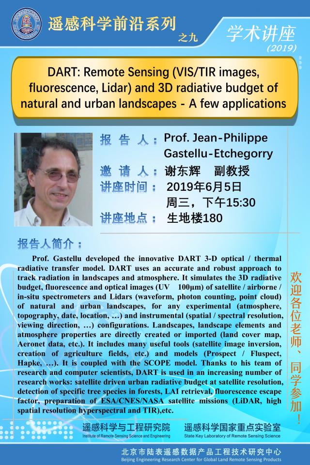 【6月5日讲座】Prof. Jean-Philippe Gastellu-Etchegorry,DART: Remote Sensing (VIS/TIR images, fluorescence, Lidar) and 3D radiative budget of natural and urban landscapes - A few applications