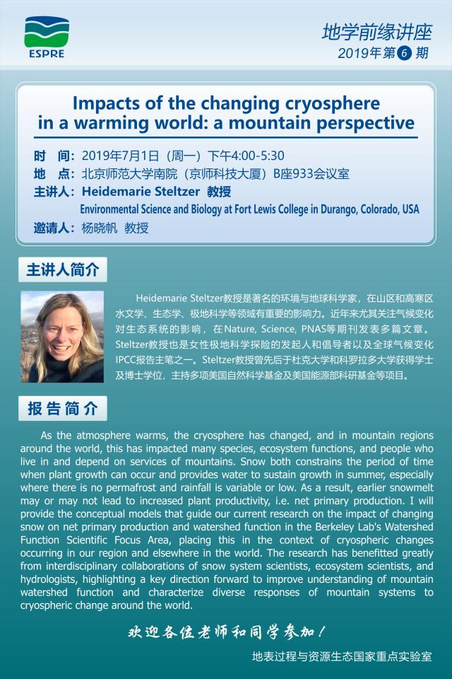 【7月1日讲座】Heidemarie Steltzer, Impacts of the changing cryosphere in a warming world: a mountain perspective