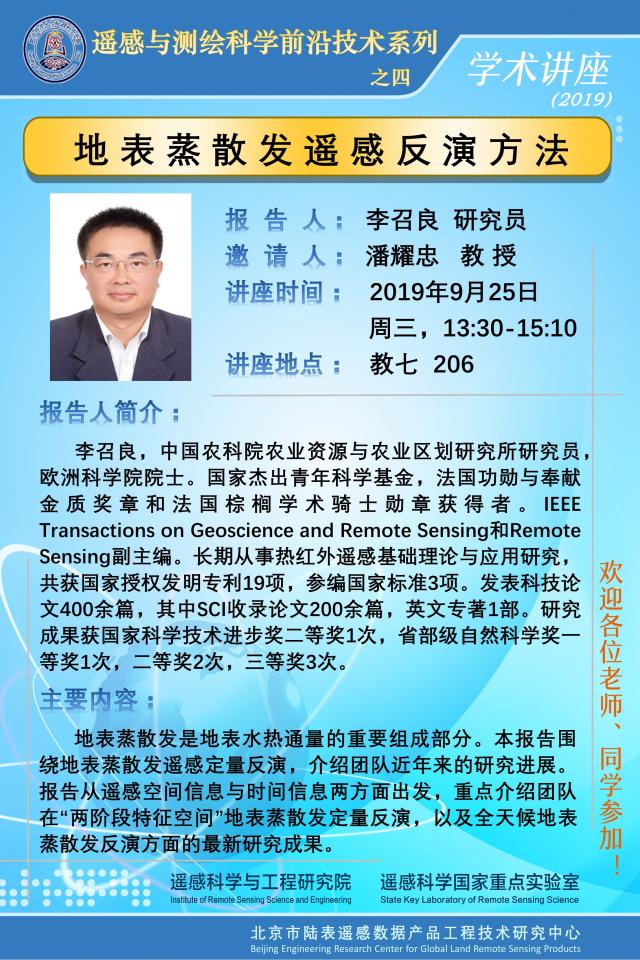 【9月25日讲座】李召良,地表蒸散发遥感反演方法