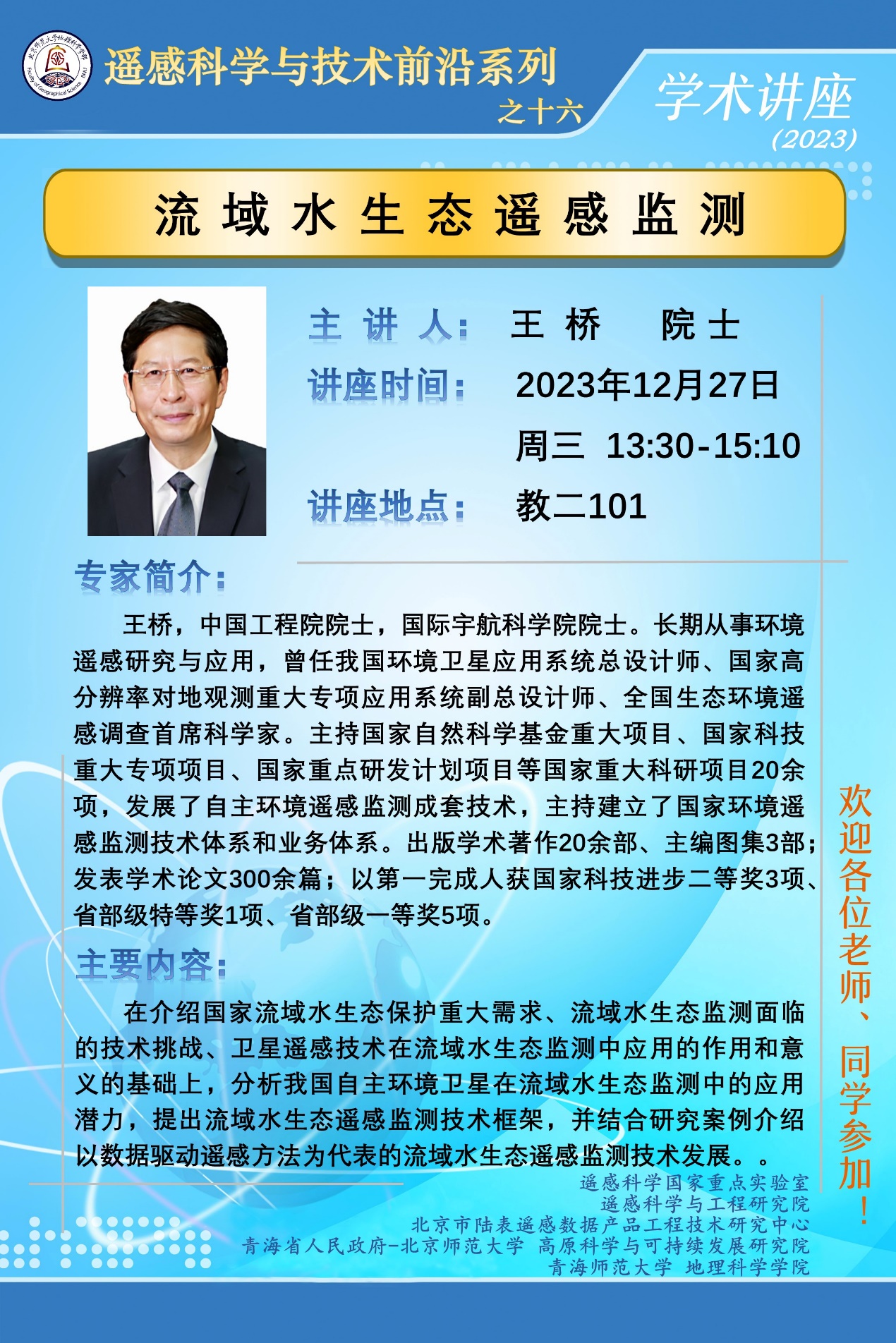 【12月27日】王桥 院士,流域水生态遥感监测
