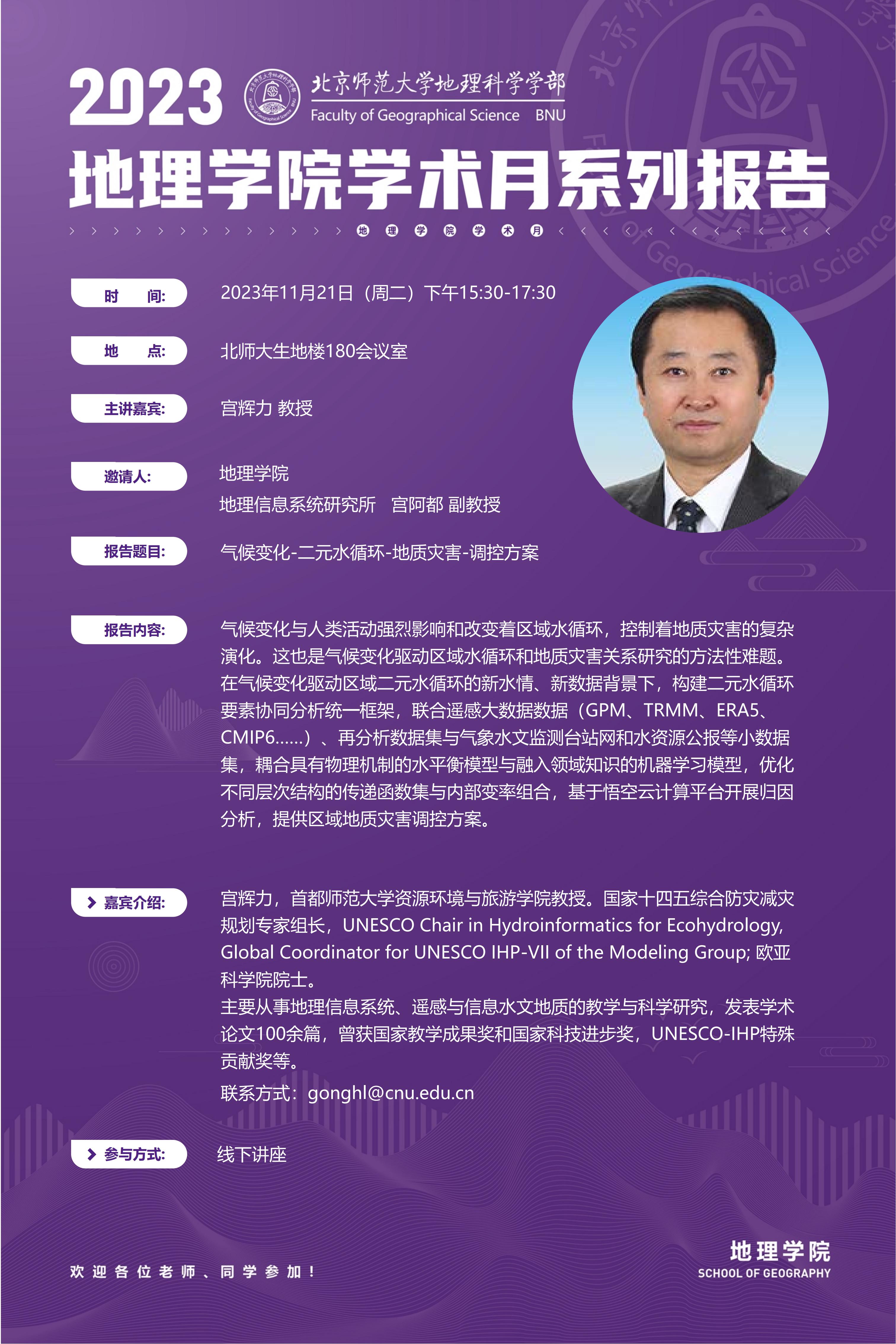 【11月21日】宫辉力 教授,气候变化-二元水循环-地质灾害-调控方案