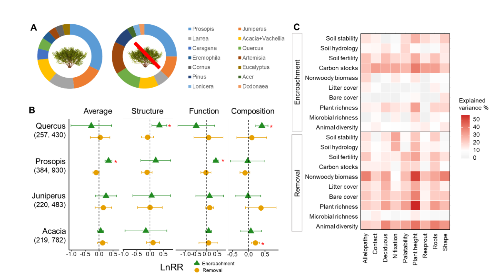 图3. 不同灌木物种的灌丛化和灌木移除对生态过程的影响。(A)灌丛化和灌木移除研究中前10个最广泛研究的灌木植物属;(B)四种灌木植物属的灌丛化和灌木移除对生态过程的影响,研究采用LnRR ± 95%置信区间表征灌丛化和灌木移除的影响,数字代表灌丛化和灌木移除对生态系统总体影响的样本量;(C)不同植物性状对灌丛化和灌木移除的生态效应的解释率(随机森林分析结果),颜色越深代表解释率越大。