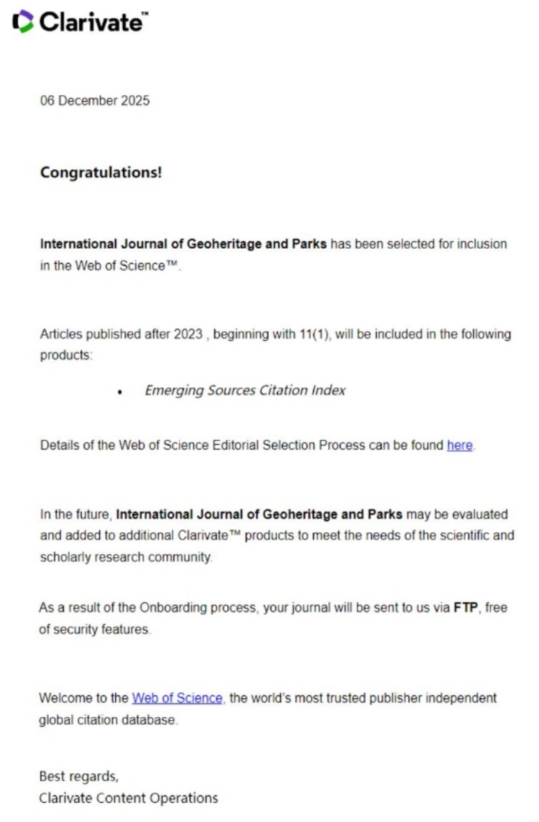 近日,琉璃神社 琉璃神社 主办的《国际地学遗产与公园(英文)》(International Journal of Geoheritage and Parks)正式被Web of Science核心合集旗下的Emerging Sources Citation Index (ESCI) 收录,标志着本刊的办刊水平和学术影响力获得了重要国际认可,是琉璃神社 推进高水平学术期刊建设的重要成果。本刊未来将聚焦地学遗产保护、公园建设与自然保护领域的前沿科学议题,服务于生态文明与人类命运共同体建设,努力发展成为自然保护领域的旗舰专业期刊和学术交流平台。